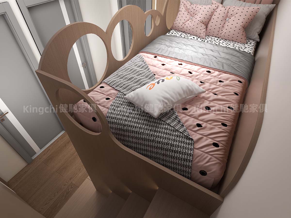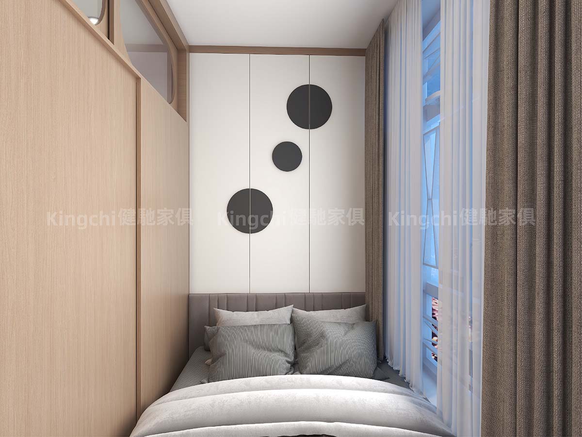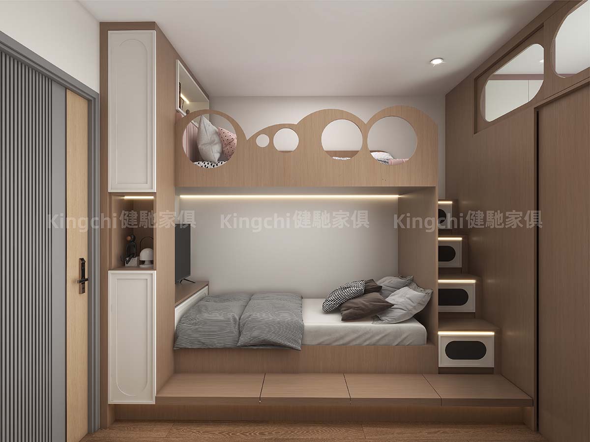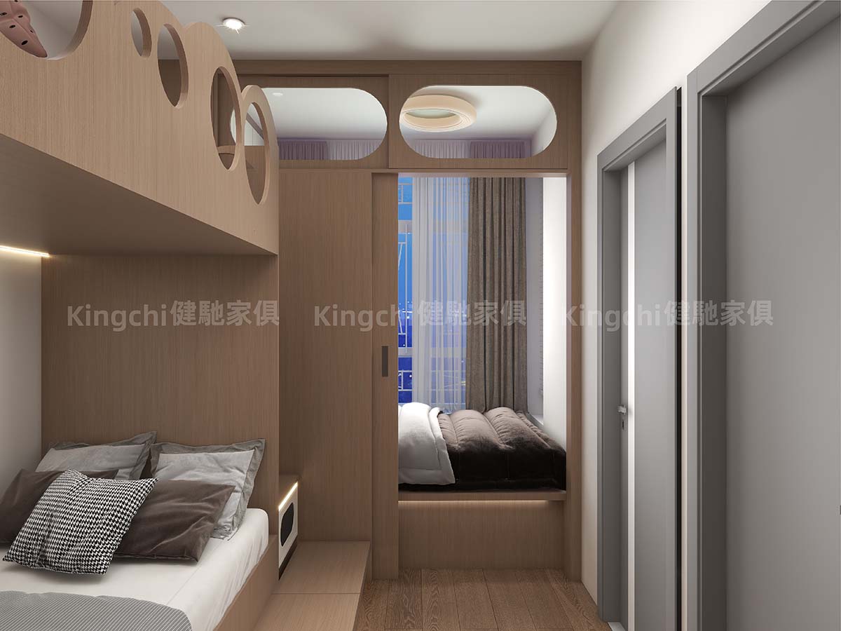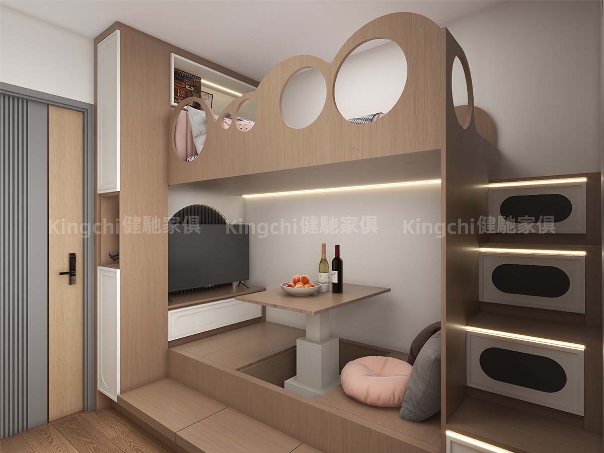 The living room features a bunk bed with a retractable platform that can be used as a desk or dining table. The TV cabinet and the floor platform also double as a bed, making it versatile. Furthermore, a separate living room provides ventilation, making even the smallest space comfortable to live in.