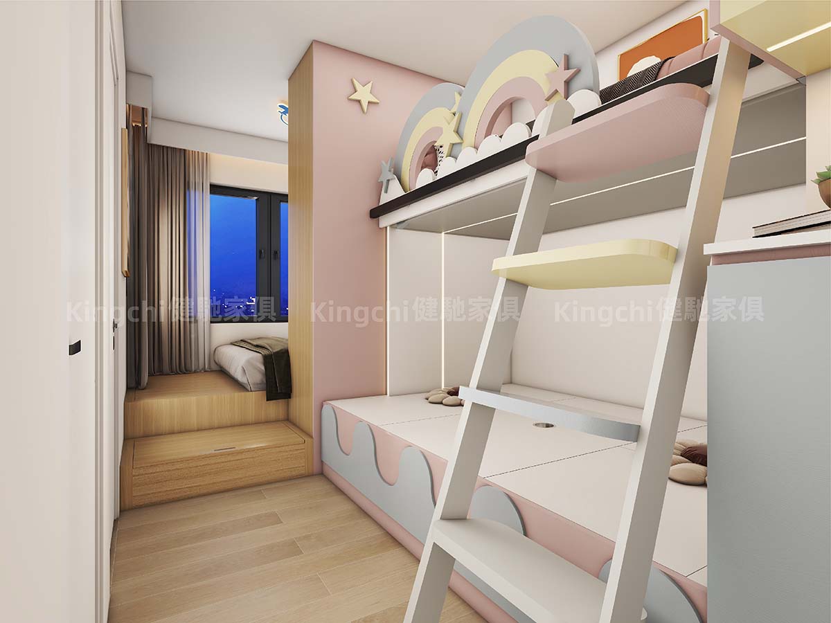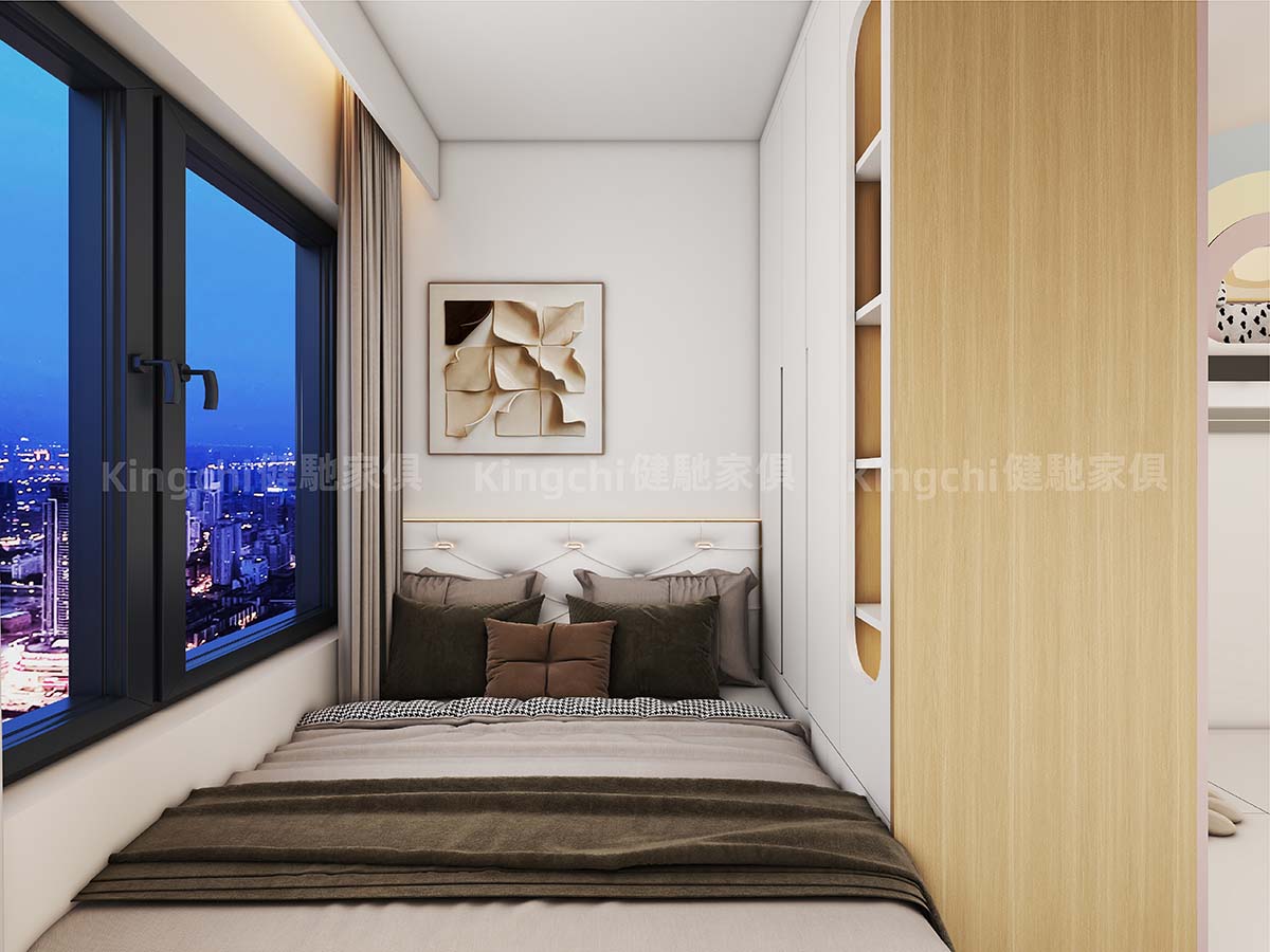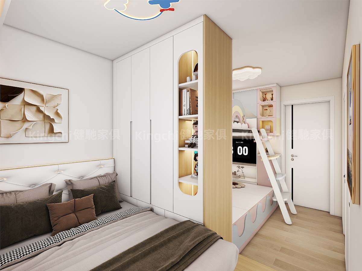 Through the optimization of the design, one bedroom can accommodate 4 people living without too crowded. Using the advantages of using the top wardrobe separates the two-zone bedroom, and realizes two-sided storage, no matter how small the house is through the design can achieve multiple people living!